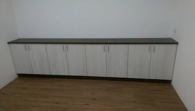 系統矮櫃因放置機櫃.右側門片縮短高度.預留透氣孔